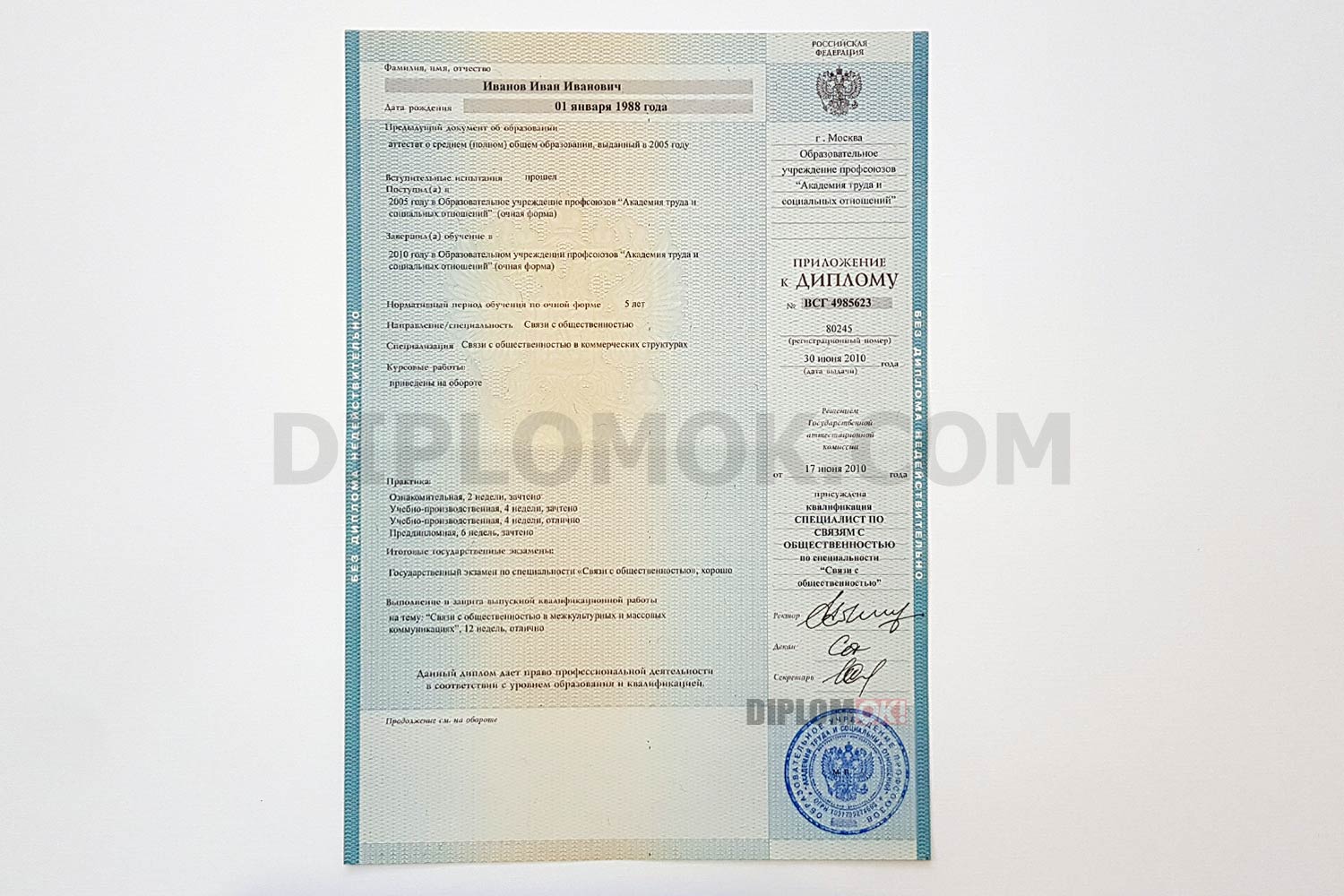 С правой стороны приложения к диплому, ниже слов «Российская Федерация» и изображения Государственного герба Российской Федерации указываются город, где расположен вуз, полное официальное наименование вуза в именительном падеже, номер, регистрационный номер и дата выдачи диплома по книге регистрации выданных дипломов с указанием числа (цифрами), месяца (прописью) и года (четырехзначным числом цифрами), вносятся другие записи в соответствии с текстом основной части диплома.